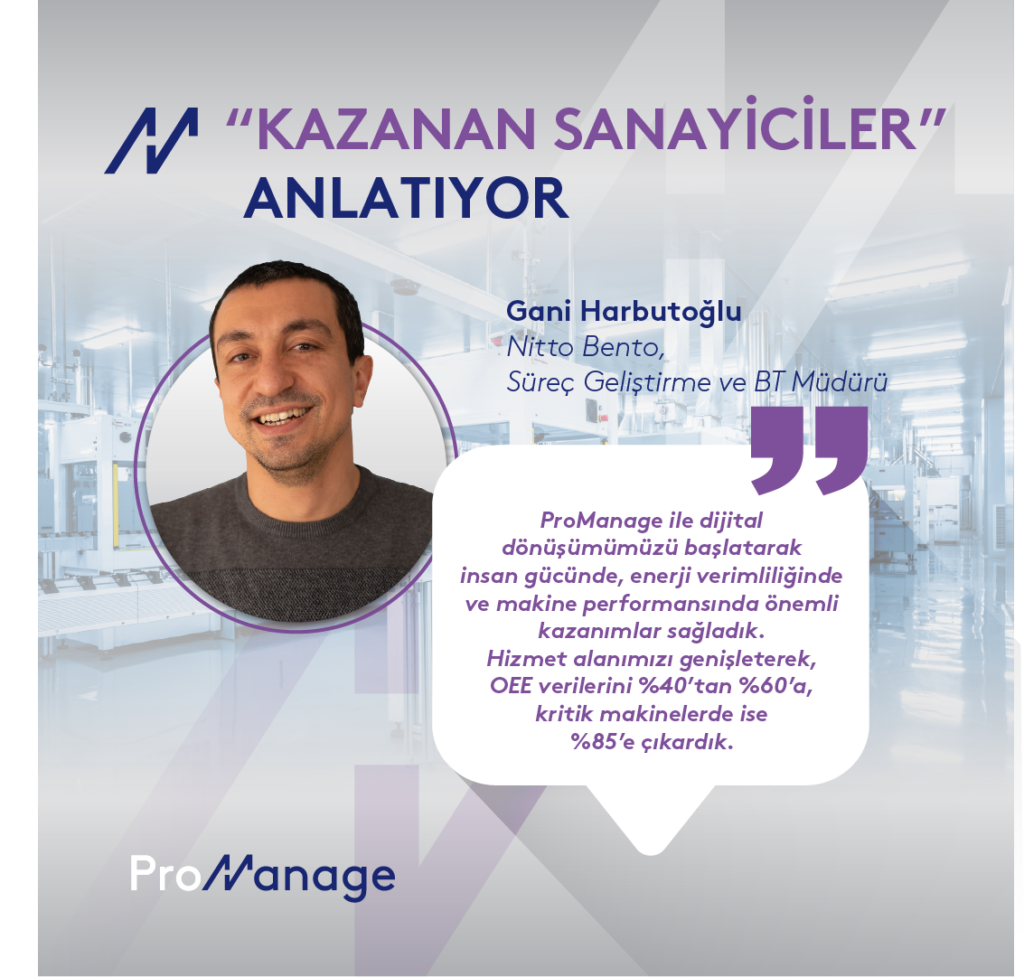 Global merkezi Japonya olan Nitto Bento, genel merkez tarafından dijitalleşme süreci oldukça desteklenen bir firmaydı. Bunun ışığında, dünya çapında 300’e yakın fabrikası bulunan şirketin dijitalleşme öncüsü ProManage sayesinde Türkiye oldu. Bunu çalışanlara ve iş ortamına en büyük katkısı ise “Aynı dili konuşmak” oldu. Mühendisler, teknisyenler ve ustalar hep bir ağızdan aynı veriler üzerinden konuştular ve dijitalleşme süreci bir çırpıda ileri bir konumda yerini aldı.