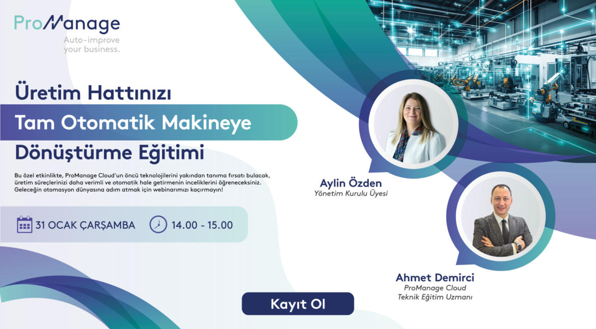 ProManage Yönetim Kurulu Üyesi Aylin Tülay Özden ve ProManage Cloud Teknik Eğitim Uzmanı Ahmet Demirci’nin rehberliğinde gerçekleşecek olan “Üretim Hattınızı Tam Otomatik Makineye Dönüştürme Eğitimi” konulu webinarımıza sizleri davet ediyoruz!
